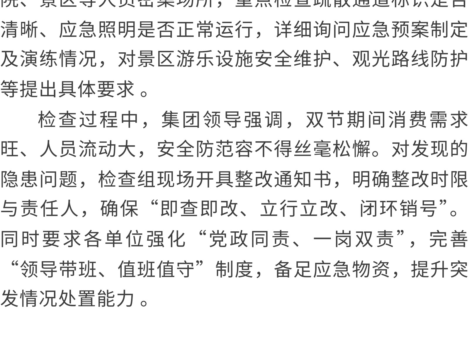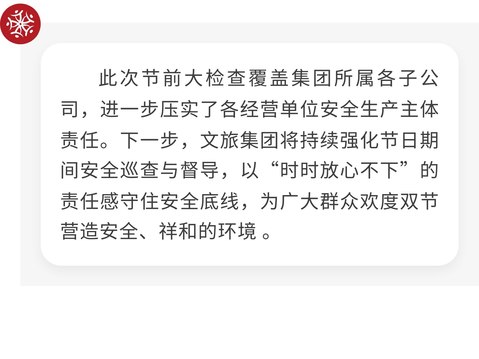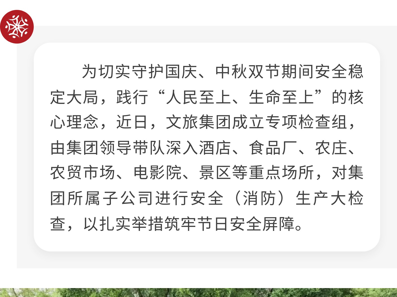 【筑牢安全防線 護航雙節(jié)安寧】文旅集團開展節(jié)前安全(消防)生產(chǎn)大檢查 發(fā)布時間:2025年09月30日 17時來源:本站原創(chuàng)瀏覽:22 人次