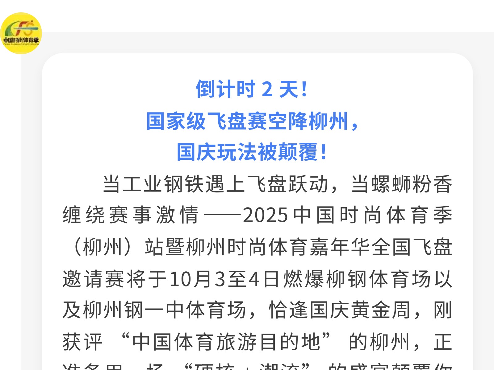國慶赴柳!鋼鐵賽場飛盤燃,柳州這座體育旅游之城藏不住了 發(fā)布時間:2025年10月02日 17時來源:本站原創(chuàng)瀏覽:25 人次