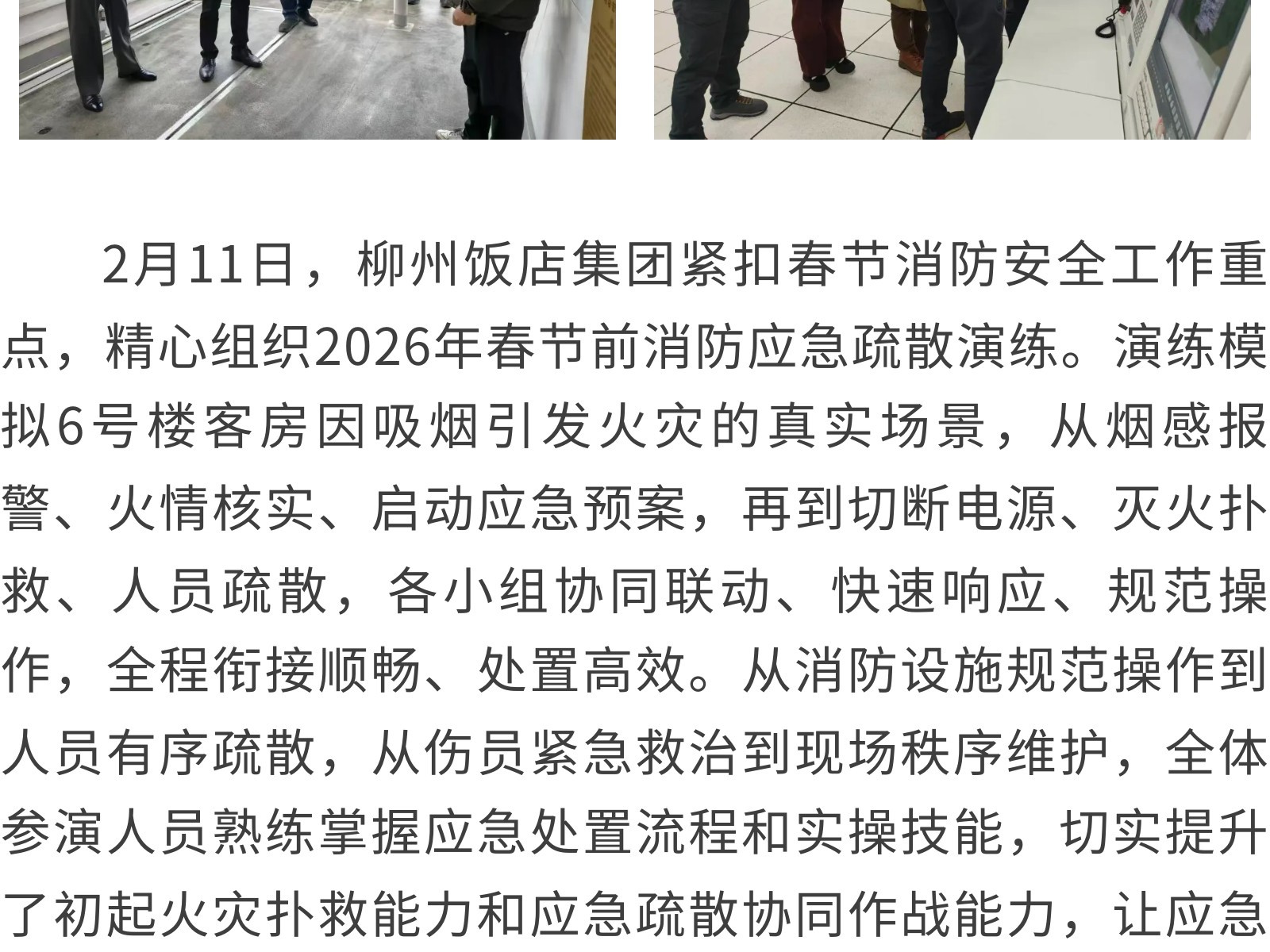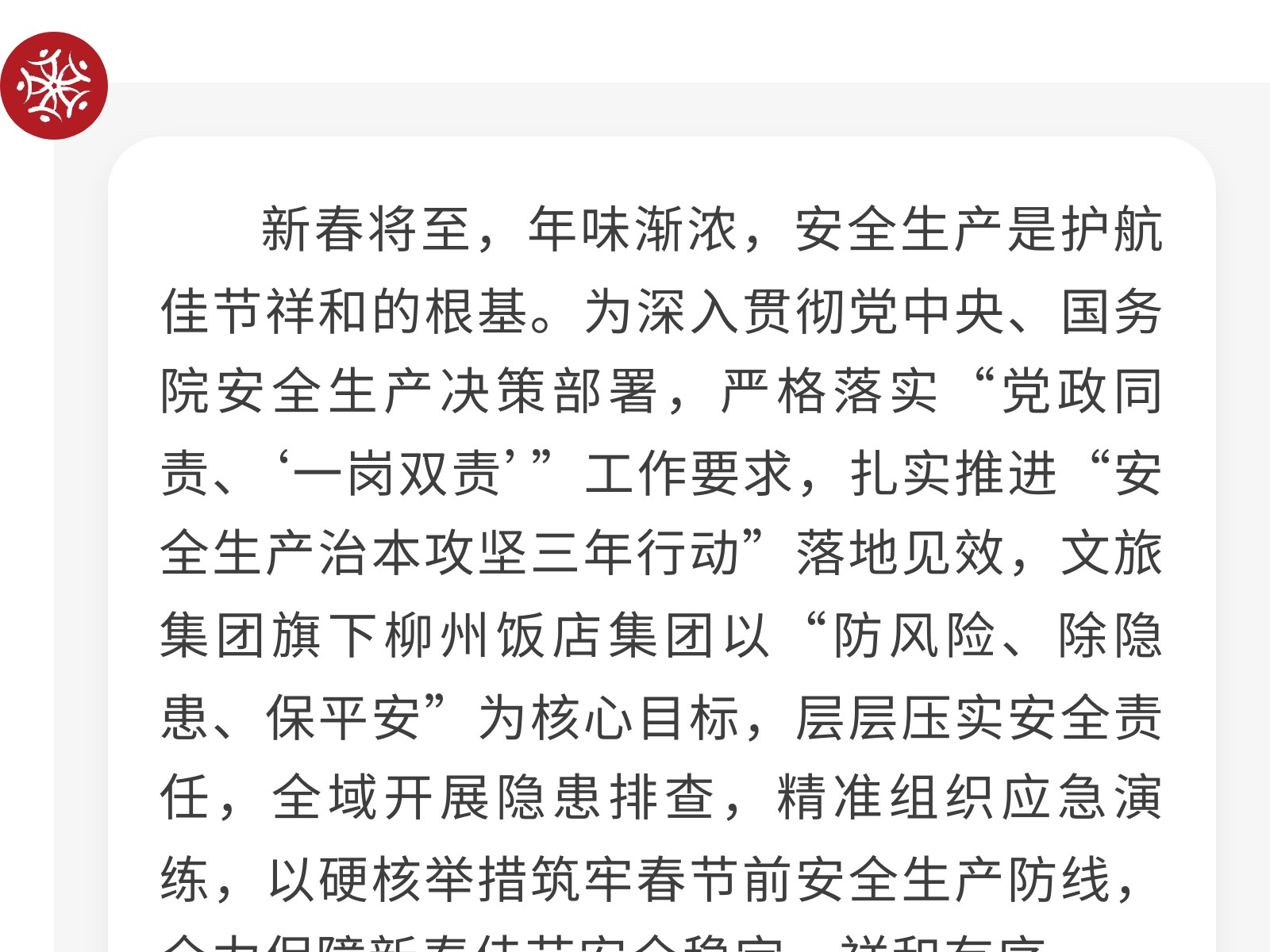 織密安全防護(hù)網(wǎng) 護(hù)航新春平安年——柳州飯店集團(tuán)開(kāi)展春節(jié)前安全生產(chǎn)系列活動(dòng) 發(fā)布時(shí)間:2026年02月13日 13時(shí)來(lái)源:本站原創(chuàng)瀏覽:50 人次